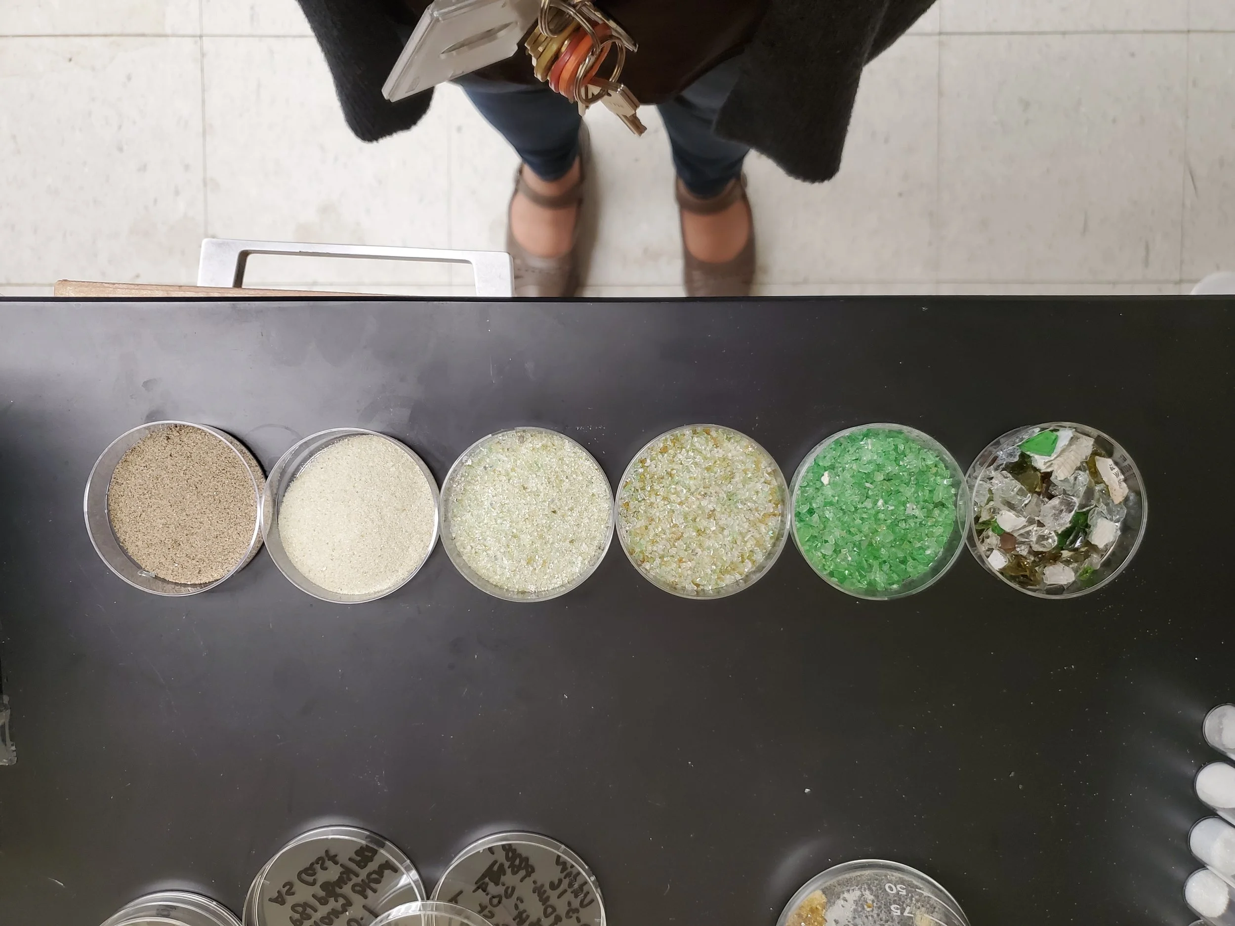 We found trace amounts (parts-per-million) of elements used in glass making, but levels were either comparable to or less than levels found in our native soil or well below regulatory levels. For example, lead levels were ~50 ppm, well below the 100 ppm limit for growing root vegetables in soil and the 400 ppm limit for children’s playgrounds. Furthermore, no potentially hazardous elements leached out of the sand during standardized testing that simulates soil-to-groundwater transmission (TCLP: toxicity characteristic leaching procedure, see the report from Waypoint Analytical here). In terms of labels, the glass pulverizing process removes nearly all non-glass contaminants from the glass sand product we use for restoration.